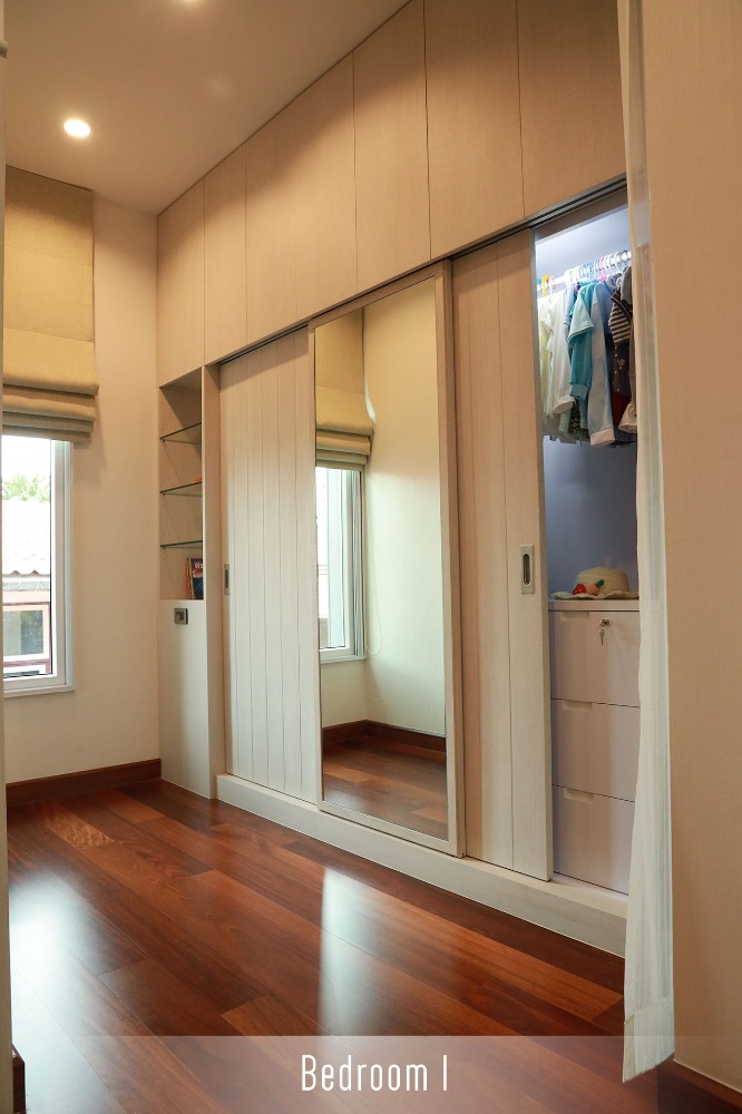 - เฟอร์นิเจอร์ built-in เป็นโครงไม้สัก ปิดผิวด้วย laminate ลายไม้ทั้งหลัง